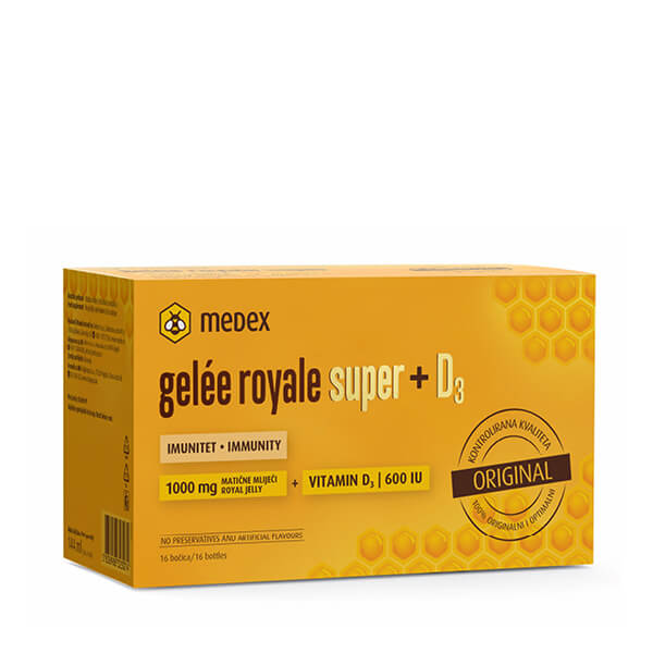 Vitamin D, naročito u zimskom period, je vitamin od izuzetne važnosti za organizam. Medex Gelée Royale Super kombinacija matične mliječi i vitamina D, preporučuje se svakodnevno prije doručka, najmanje 90 dana, nakon čega se pravi pauza od dvije sedmice.