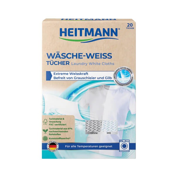 Heitmann maramice za izbjeljivanje rublja uklanjaju žućkaste i sivkaste tonove iz odjeće, bez upotrebe izbjeljivača.Praktičan oblik maramice.Snažna formula za bijelinu.Bez izbjeljivača.Pogodno za sve temperature i deterdžente.