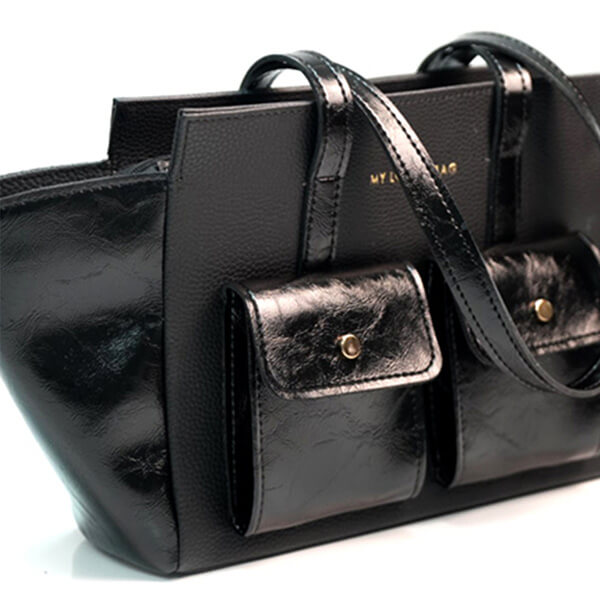 Torba većih dimenzija s “one size” ručkama, izrađena od kombinacije dviju tekstura umjetne kože s ukrasnim džepovima na licu torbe.