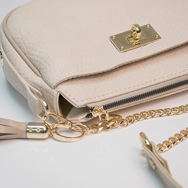 Uz torbu dolazi remen kombiniran s lancem te širi tekstilni remen, što pruža prilagođavanje različitim prilikama i stilovima nošenja. Dodatni privjesak u formi resica daje dozu razigranosti i ženstvenosti.