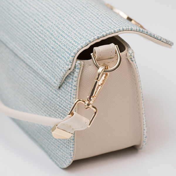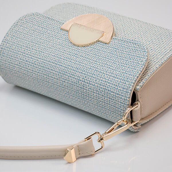 Mini torbica elegantnog dizajna, kruće forme, s unikatnom kopčom. Na torbici je elegantna ručkica koju je moguće skidati. Uz torbu dolazi i dugi remen.