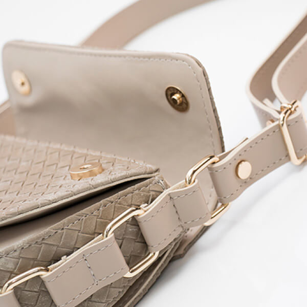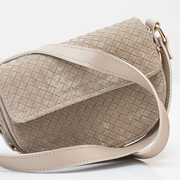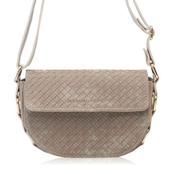 Torbica manjih dimenzija i neobičnog, blago zaobljenog oblika. Krasi je suptilni utisnuti My Lovely Bag natpis na poklopcu te zlatne karike na bočnim stranama.