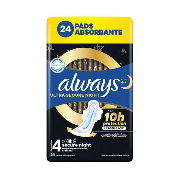 Higijenski ulošci Always Ultra Secure Night Extra posebno su dizajnirani za pouzdanu noćnu zaštitu. Imaju 9 % duži prednji dio i 85 % duži stražnji dio. Mirno spavajte, uz trostruku zaštitu uložaka ALWAYS Ultra. Tehnologijom LeakGuard jamče cjelovitu, pouzdanu cjelonoćnu zaštitu od propuštanja za vrijeme mjesečnice. U trenu upijaju tekućinu i drže je daleko od kože zahvaljujući sustavu InstantDry. Tehnologija OdourLock neutralizira neugodne mirise kako biste se osjećali svježe i čisto. Dermatološki odobrilo udruženje Skin Health Alliance.