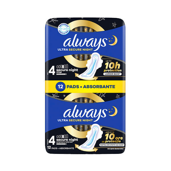 always ULTRA 4 secure night, ulošci sa krilcima koriste najnoviju tehnologiju za stvaranje višenamjenskog uloška sa 3 značajne karakteristike za dnevnu i noćnu zaštitu. InstantDry sistem upija tečnost u nekoliko sekundi i drži vlagu dalje od kože. Tehnologija LeakGuard zadržava tečnost i pomaže u sprečavanju curenja. Takođe, sadrži tehnologiju OdourLock koja neutrališe mirise tako da se osjećate svježe i čisto tokom cijele menstruacije. Uz always ULTRA možete se osećati samouvereno cijeli dan. Dermatološki odobreno.