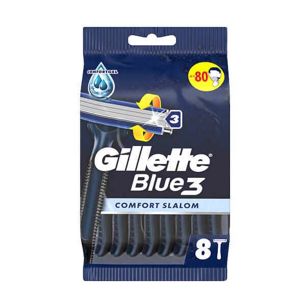 Gillette Blue3 Comfort jednokratne britvice s 3 oštrice prekrivene su kromom i osiguravaju do 10 ugodnih brijanja. Glava pokretljiva za 40° lako se prilagođava konturama lica, a oštrice se brže i jednostavnije ispiru nego kod britvica Blue II Plus. Lubrikantna trakica s tehnologijom Comfortgel aktivira se u dodiru s vodom za dodatnu svježinu i ugodnost. Osim toga, gumena protuklizna drška britvice Gillette Blue3 Comfort olakšava držanje u ruci. Za lakšu kontrolu i preciznost brijanja.
