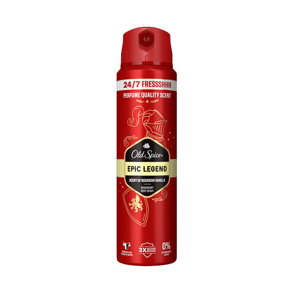 Uživajte u svježini i samopouzdanju 24 sata dnevno uz Old Spice's Epic Legend dezodorans. Trostruka zaštitna formula pruža dugotrajan miris, pouzdanu zaštitu od neugodnih mirisa koji će učiniti da se osjećate svježe 24/7. Osvojit će vas miris burbon vanilije, trešnje, dimljenog hrasta i toplog jantara . Ne sadrži aluminijeve soli i ne ostavlja tragove na crnoj i bijeloj odjeći.