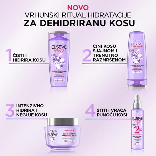 Predstavljamo NOVU Elseve Hyaluron Plump liniju brenda L’Oréal Paris za dehidriranu kosu. Obogaćen hijaluronskom kiselinom, Hyaluron Plump pruža kosi dozu hidratacije koja traje 72 sata.