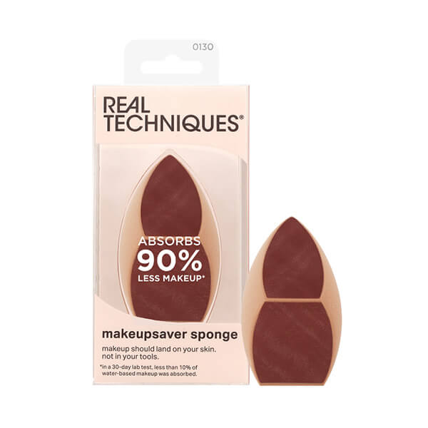 Real Techniques Makeupsaver spužva je laboratorijski dokazana da UPIJA 90% MANJE ŠMINKE. Dizajnirana je s inovativnom tehnologijom otiska prsta kako bi se smanjila apsorpcija šminke. Nova Makeupsaver spužva pruža prirodan finiš bez mrlja, a novi dizajn dopire do svih dijelova lica, dok idalje ostavlja utisak najprepoznatljivije i najprodavanije spužvice.