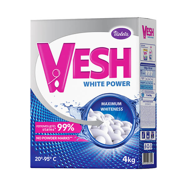 Vesh WHITE POWER Prašak Uklanja i najtvrdokornije mrlje u samo jednom pranju, bez potrebe dodavanja agresivnih izbjeljivača koji mogu oštetiti odjeću. Učinkovito uklanja i do 99% svakodnevnih mrlja.