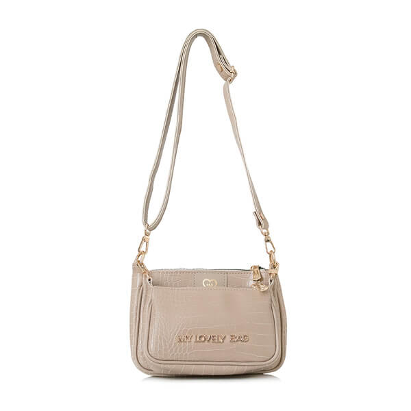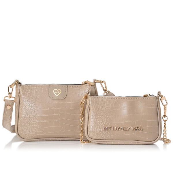 Mekana dupla torbica urbanog dizajna. Zatvara se na patent. Uz torbu dolazi podesivi remen, podesiv od nošenja na ramenu do nošenja preko tijela te kraći lanac.