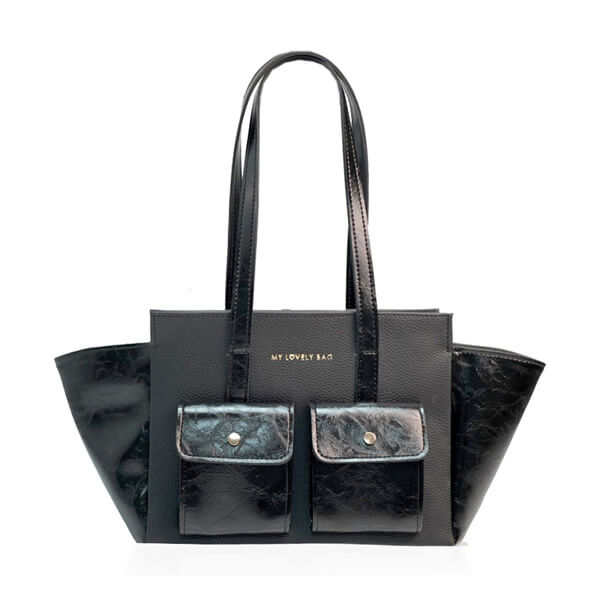 Torba većih dimenzija s “one size” ručkama, izrađena od kombinacije dviju tekstura umjetne kože s ukrasnim džepovima na licu torbe.