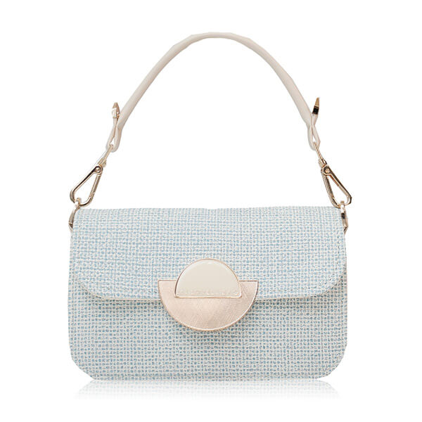 Mini torbica elegantnog dizajna, kruće forme, s unikatnom kopčom. Na torbici je elegantna ručkica koju je moguće skidati. Uz torbu dolazi i dugi remen.