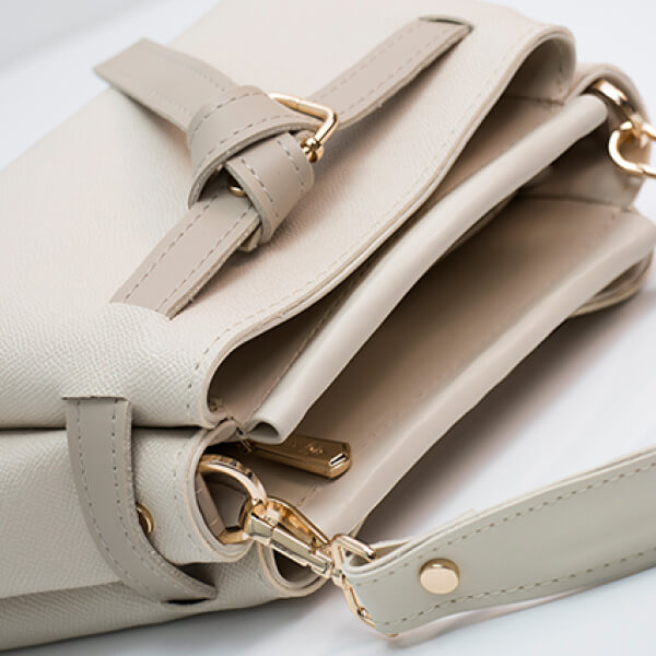 Blago trapezasta torba minimalističkog dizajna sastavljena od tri praktične pregrade. Ima ručkicu za nošenje u ruci te dugi podesivi remen za nošenje preko tijela ili na ramenu.