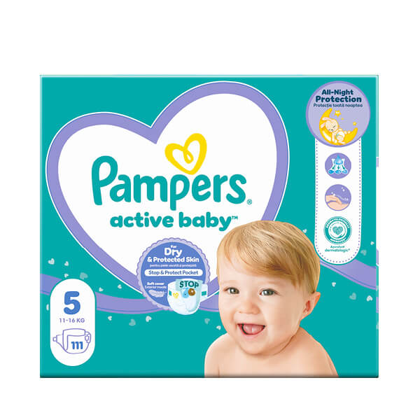 Pampers active baby pelene osiguravaju dvostruku zaštitu danju ili noću. Dječija koža je osjetljiva i zato su pelene napravljene bez losiona, parfema i prirodnog lateksa. Savremena tehnologija apsorpcijskih kanala ima jedinstveni sloj „sleep“ koji omogućava brzu i ravnomjernu raspodjelu tečnosti i održava kožu suhom. Pored toga, odlikuje ih prozračnost materijala i elastičnost koja doprinosi maksimalnoj udobnosti i slobodi kretanja. Pampers active baby pogodne su i za djecu koja su aktivna i tokom sna. Za zadovoljnu djecu i roditelje!