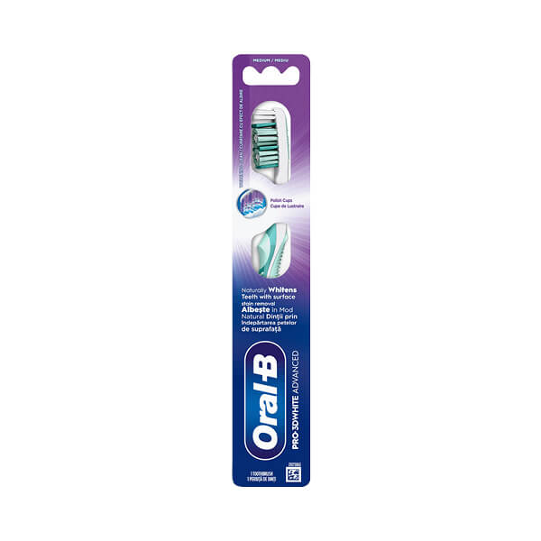 Lako uklonite plak i mrlje uz Oral-B PRO 3D WHITE ADVANCED četkicu za zube. Ova ručna četkica pruža dubinsko čišćenje iz svih uglova, uklanjajući plak, i do 80% površinskih mrlja. Precizne karakteristike uključuju vlakna različitih visina "Power Tip" koja prodiru između zuba, vrhove za teško dostupna mjesta iza kutnjaka i višestruke polirajuće elemente koji obuhvataju svaki zub i uklanjaju površinske mrlje. Četkica poseduje i ugrađeni čistač jezika. Postignite blistaviji osmijeh i vodite računa o svom oralnom zdravlju uz Oral-B PRO 3D WHITE ADVANCED četkicu za zube.
